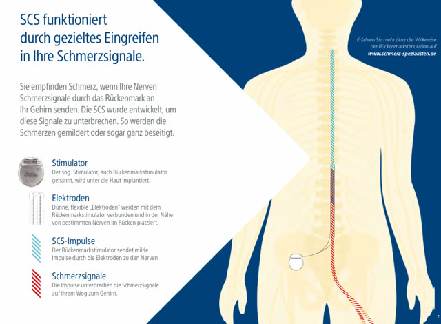 Dabei werden von einem Generator, der so groß ist wie ein Herzschrittmacher, elektrische Impulse über spezielle Elektroden an das Rückenmark oder an Nerven bzw. Spinalganglien abgegeben.